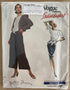 A Vogue Designer Original by Betty Jackson. A very loos-fitting, unlined, below waist jacket with slightly extended shoulders, shoulder pads, yoke back, flared back and two-piece sleeves. Loose-fitting top with mock neckband, front pleats. peplum with single layer tie ends, back opening with button/loop and above elbow sleeves. The above-knee skirt has a waistband, with front pleats, back zipper and hemline vent. The wide-legged trousers have a waistband with carriers, shaped front pockets and back zipper.