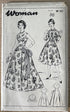 A day dress or evening dress. Dress has a fitted bodice with V neck and V at back. For the long dress, at the waist is a large, dramatic side bow that is sewn into the seams. The day dress is below the knee without the bow. The jacket is fitted with a round collar and three-quarter sleeves and waistband.